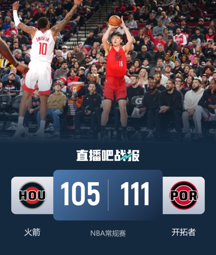 比赛开始,两队很快陷入缠斗,比分始终紧咬,卡马拉手感火热连续拿分,火箭多点开花给出回应,杨瀚森替补登场造成亚当斯犯规,两队打得难解难分,火箭轮番冲击内线频频得手,开拓者内外开花还以颜色,半场战罢火箭56-55领先开拓者。易边再战,杜兰特三分命中后得分超越张伯伦,火箭持续发力获得两位数领先,末节杨瀚森提供高质量掩护和防守,自己抛投也有,帮助开拓者轰出11-0迅速迫近比分,谢泼德抢断杨瀚森后反击扣篮得手打停开拓者,调整过后阿夫迪亚连投带罚拿分反超,双方争夺陷入白热化,关键时刻小贾巴里·史密斯连续打铁还送犯规,火箭大势已去无力回天。最终,火箭105-111再负开拓者。
