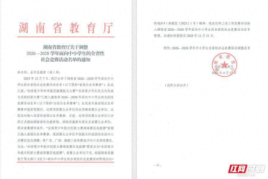 湖南省教育厅印发通知,全国青少年红色文化传承与实践创新大赛(湖南赛区赛)纳入白名单赛事。