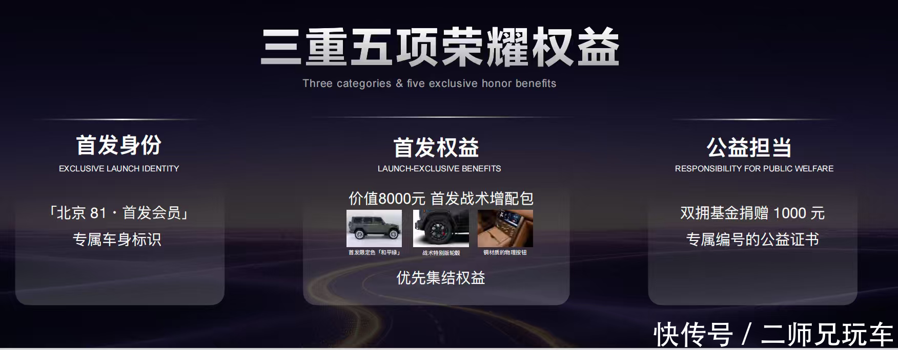 1. 专属首发身份权益盲订且最终购车的用户,将获授「北京 81・首发会员」荣誉身份,并授予线上勋章和实体徽章。首发车型将在车身多处,镌刻首发车印记,打造专属身份标识。